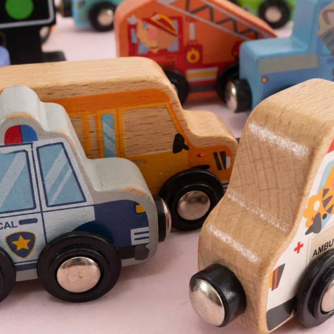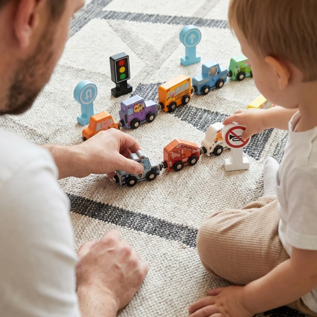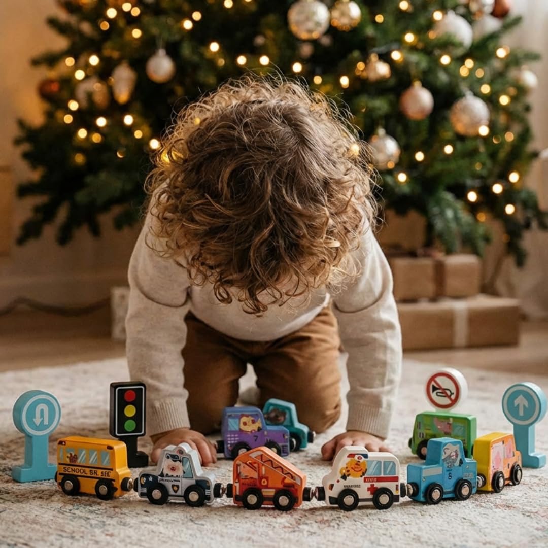 12-Piece Multi-Vehicle System: Includes specialized units like a police car, ambulance, fire engine, school bus, and mail truck for comprehensive role-play., Powerful Magnetic Linkage: Every car features double-sided industrial magnets, allowing them to join together like a train in any order., Dual-Language & Math Integration: Side panels feature numbers (1-9) and corresponding English names (Police, Ambulance, etc.), boosting early literacy and numeracy., FSC Certified Eco-Friendly Wood: Made from durable, sustainable natural wood with safe, non-toxic water-based paints that resist chipping., Inclusive Traffic Scene: Comes with detailed road signs (Red Light, Traffic Ban, U-Turn) to teach children safety from an early age through interactive play.