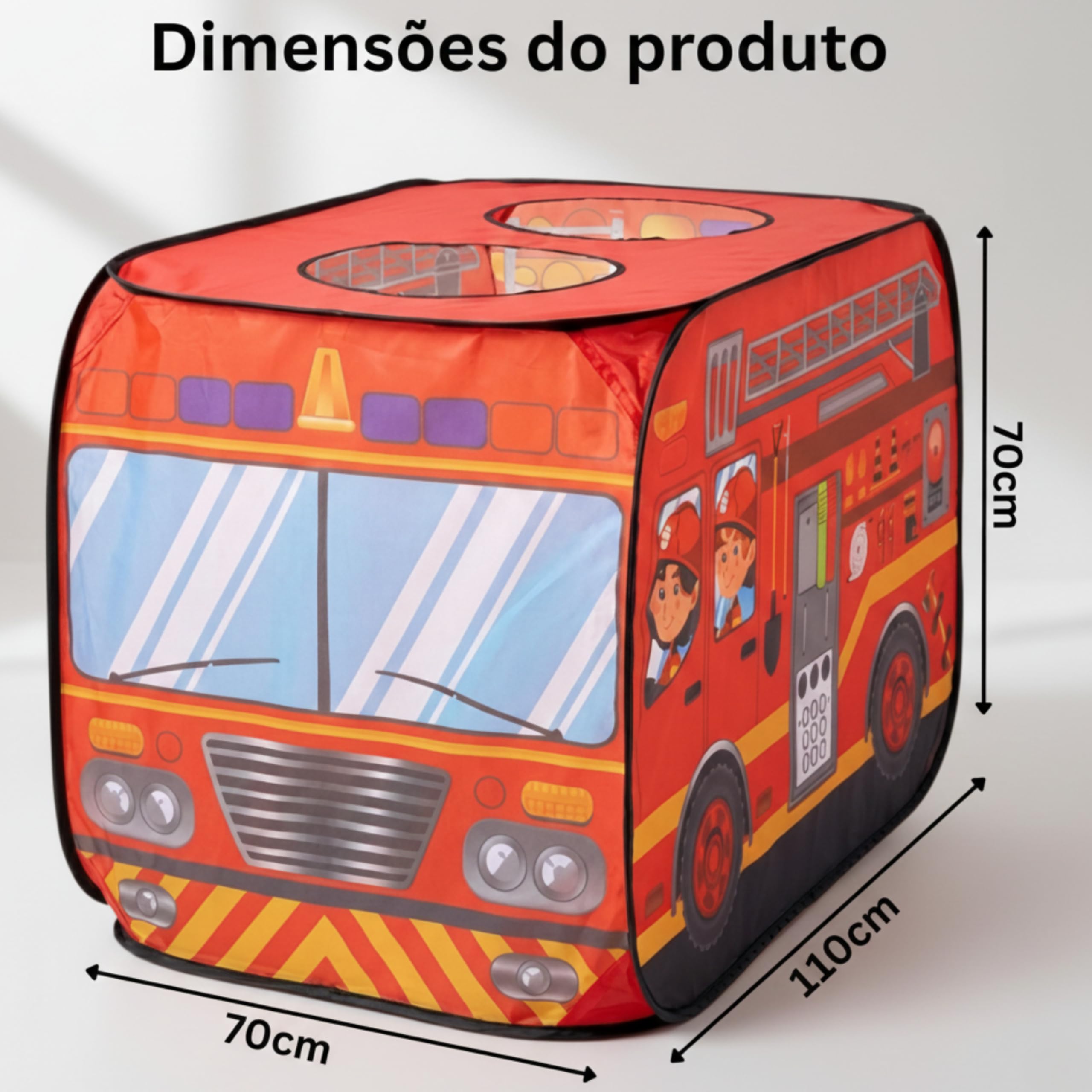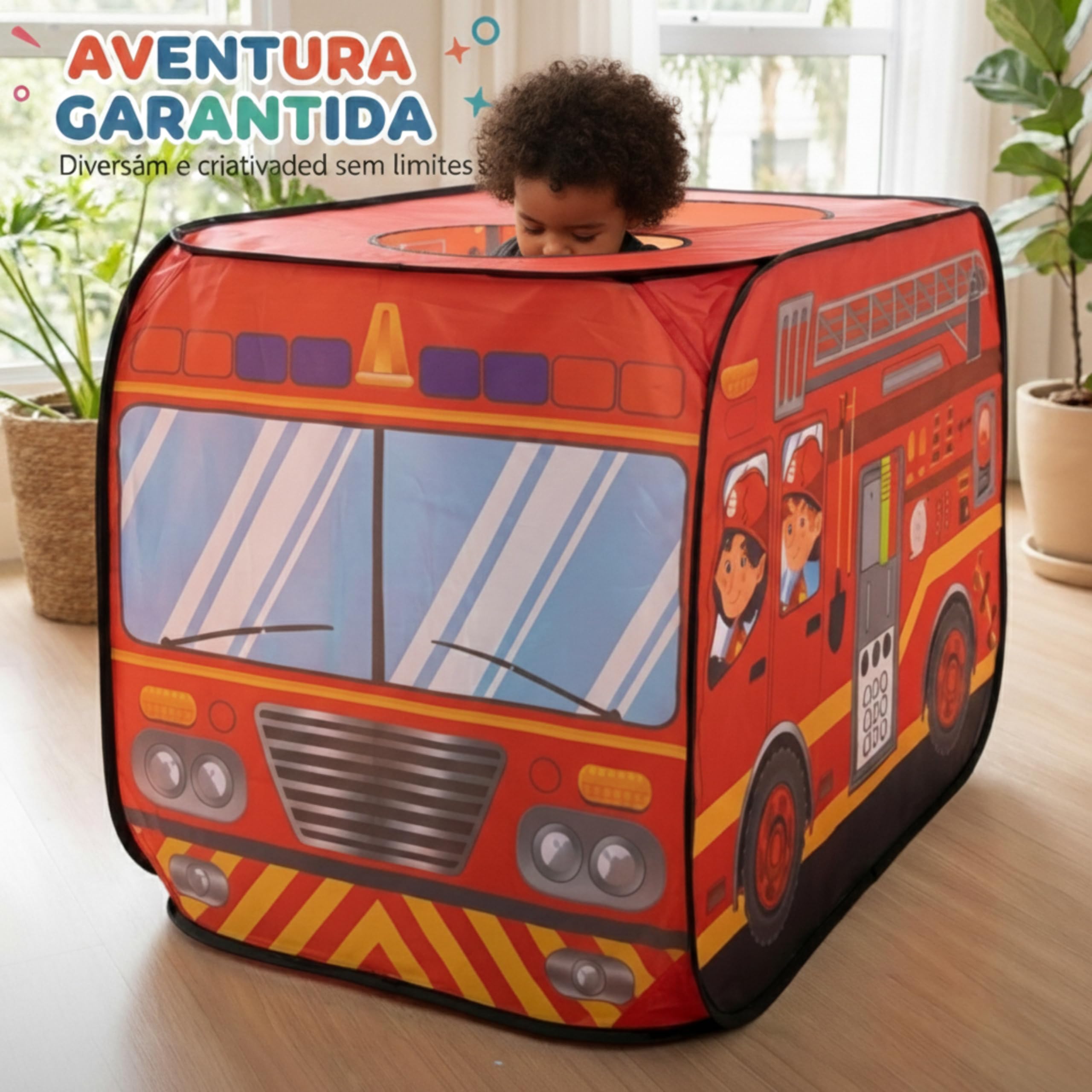 Automatic Pop-Up System: Installs instantly without poles or tools; just take it out and it springs to shape., Integrated Top Peeking Holes: Features two circular rooftop openings, perfect for standing, looking out, and immersive role-playing., Space-Saving Portability: Comes with a custom circular zippered bag for ultra-slim storage when playtime is over., High-Resolution Thematic Graphics: Detailed, non-fade fire truck designs that wrap 360 degrees for a fully immersive experience., Safe and Breathable Fabric: Lightweight, durable polyester designed for maximum air circulation during energetic play sessions.