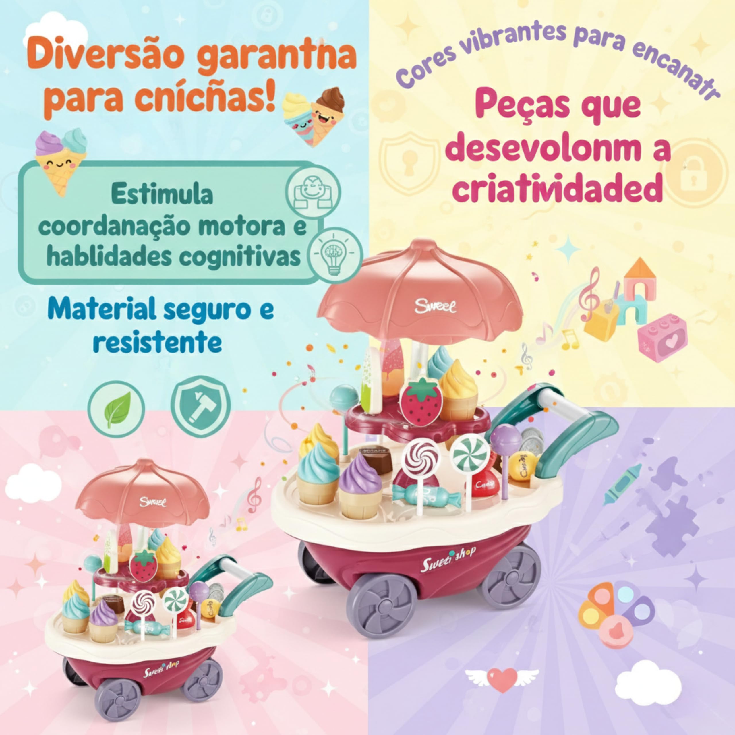Traga a Magia da Sorveteria Real para Dentro de Casa com a Kinderland Toys!Você está procurando por um brinquedo educativo que realmente prenda a atenção dos pequenos e os afaste do tablet infantil? O Carrinho de Sorvetes e Doces KL-130 da Kinderland Toys foi desenhado e testado por pais para garantir não apenas diversão, mas um aprendizado real e valioso. Muito Mais Que Um Simples CarrinhoEnquanto muitos brinquedos educativos 2 anos ou 3 anos são estáticos, nossa sorveteria ganha vida. Com 30 acessórios detalhados, incluindo donuts, picolés, pirulitos e moedinhas, seu filho(a) poderá gerenciar seu próprio negócio! É o complemento perfeito após um passeio de bicicleta ou patins, oferecendo um momento de relaxamento e foco mental. Diferente de um carro de controle remoto que consome pilhas rapidamente, nosso carrinho promove o jogo simbólico e a interação social entre menina e menino.Educação Montessori no Dia a DiaUtilizando o conceito Montessori, este brinquedo estimula a coordenação motora fina ao encaixar cada doce em seu suporte. É um exercício muito mais lúdico do que um quebra cabeça infantil ou o uso de um giz de cera em papel. A criança assume o controle, define os preços e serve os “clientes”, desenvolvendo empatia e raciocínio lógico que nem o melhor jogo de tabuleiro consegue replicar sozinho.Durabilidade e FacilidadeSabemos que a rotina com crianças pode ser intensa. Por isso, o KL-130 é construído para durar gerações. Ele é leve para mover pela casa, mas robusto para aguentar a brincadeira ativa. Para limpar, não é necessário produtos químicos complexos, apenas sabão neutro. Ocupe aquele cantinho da brinquedoteca com valor pedagógico real!Por que a Kinderland Toys é a escolha certa?Porque acreditamos que a infância merece brinquedos que estimulem o “aprender fazendo”. Adicione valor à vida do seu filho hoje com o presente que ele(a) nunca vai esquecer!