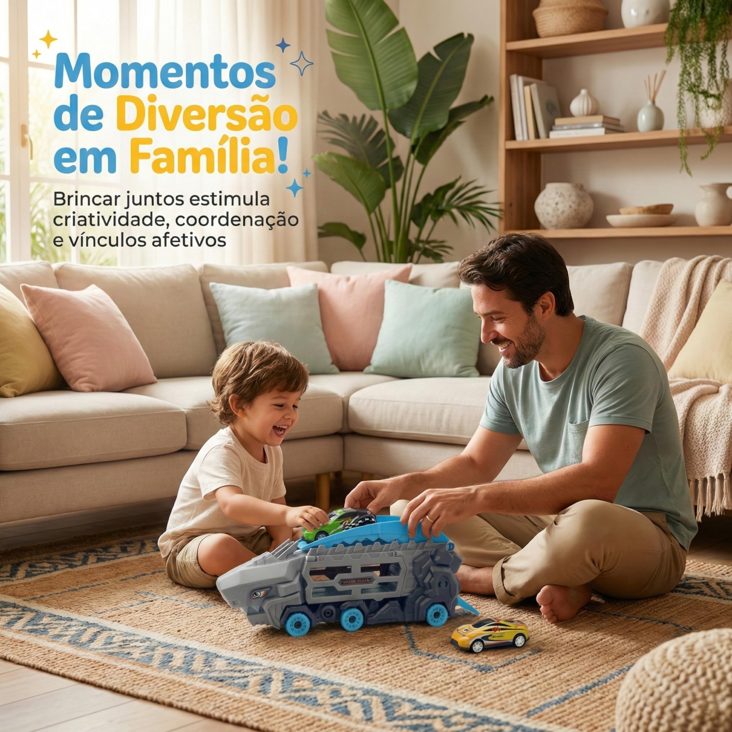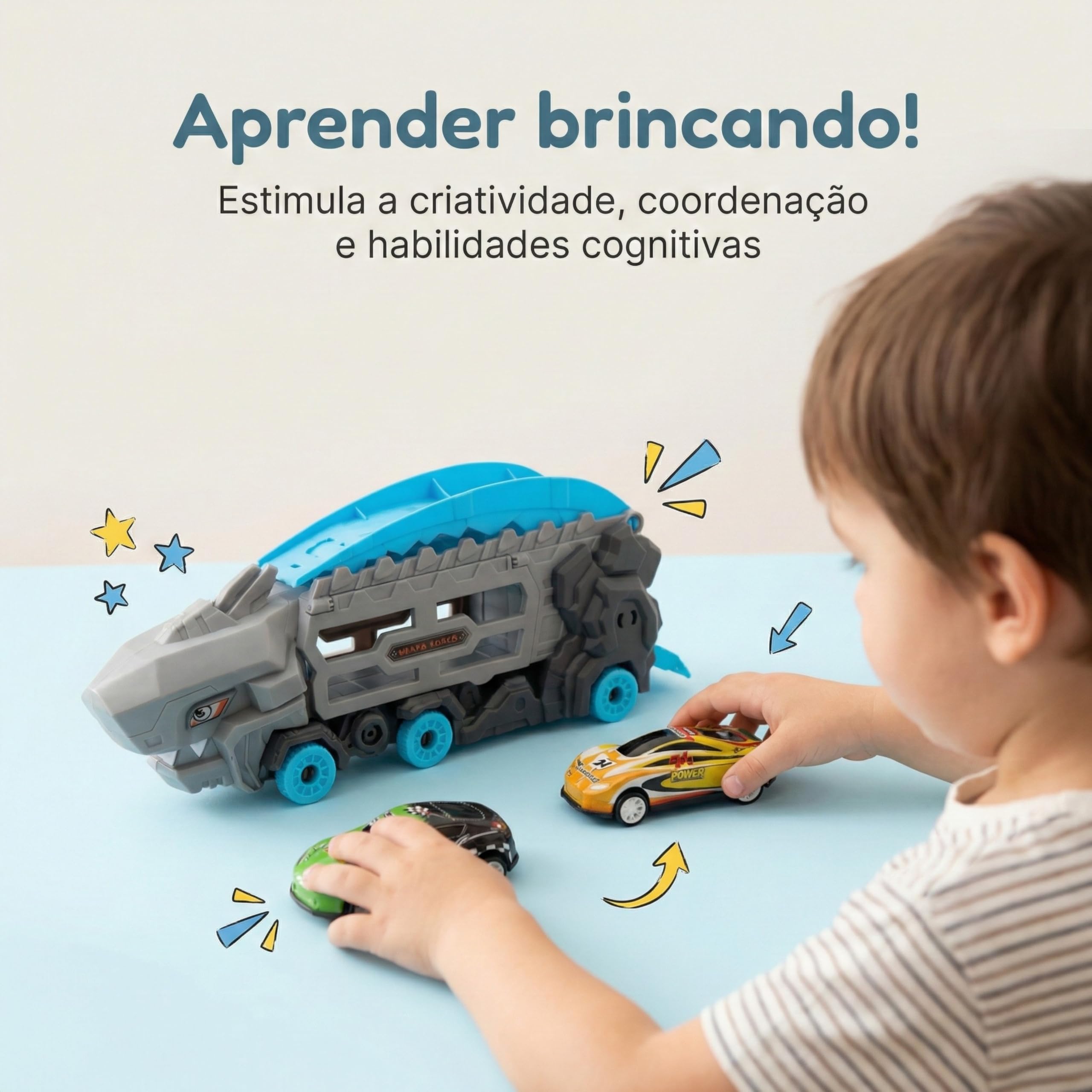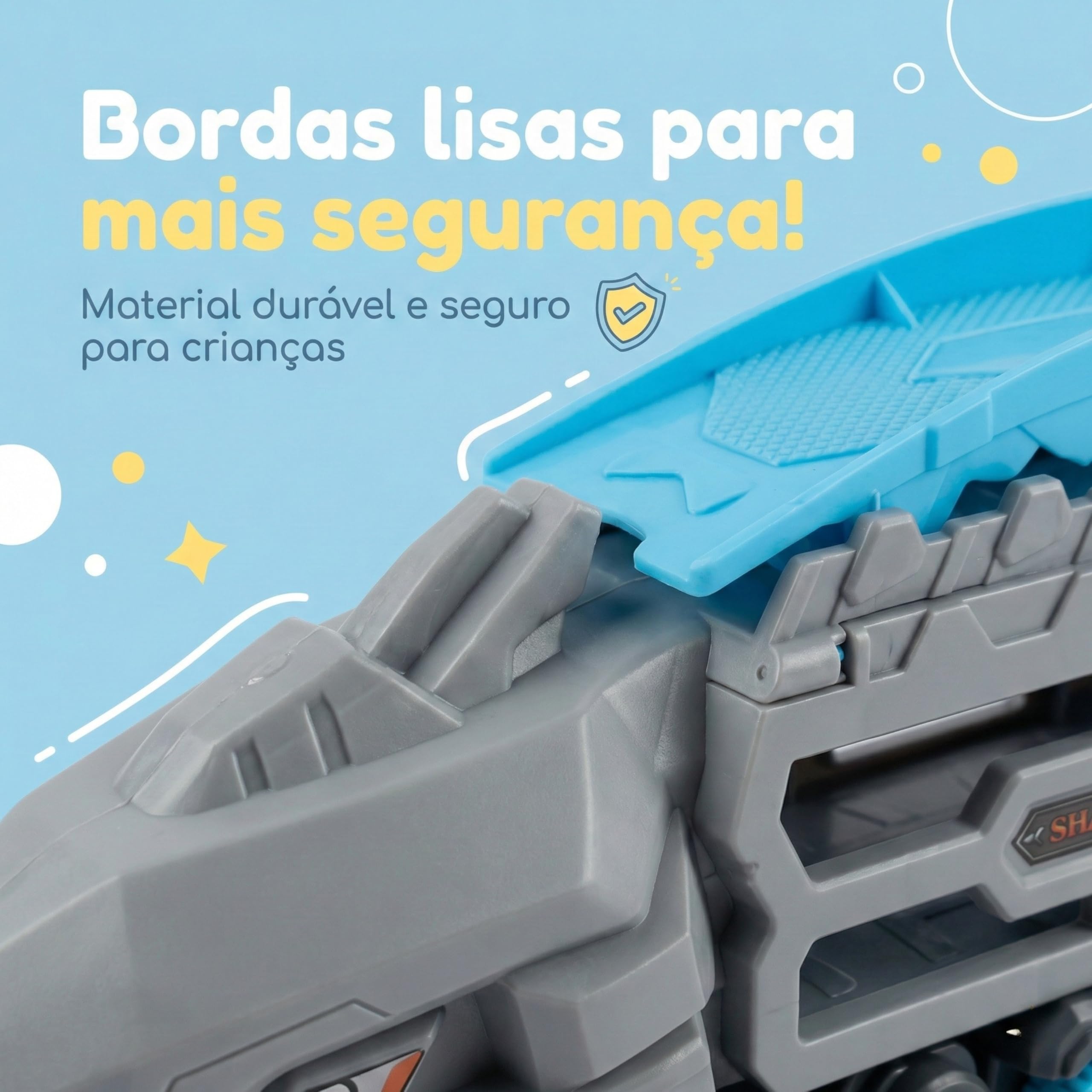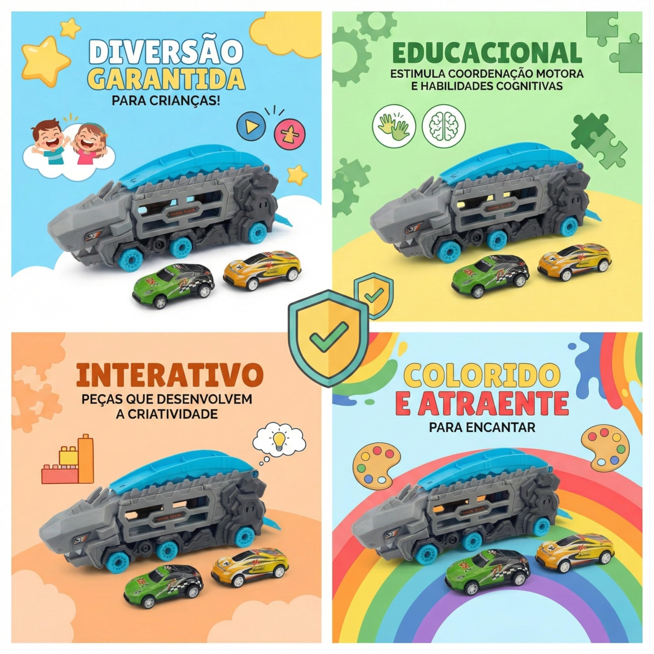 Diferente de brinquedos que perdem a graça rapidamente, como um simples mordedor ou giz de cera, o nosso Caminhão Tubarão possui uma função 2 em 1 exclusiva. Ele serve tanto como uma maleta de armazenamento para carrinhos quanto como uma potente pista de lançamento estilo catapulta. As crianças de 3 anos em diante adoram a transformação! É mais interativo que blocos magneticos e oferece mais possibilidades de narrativa que uma boneca tradicional ou um caranguejo fujão.