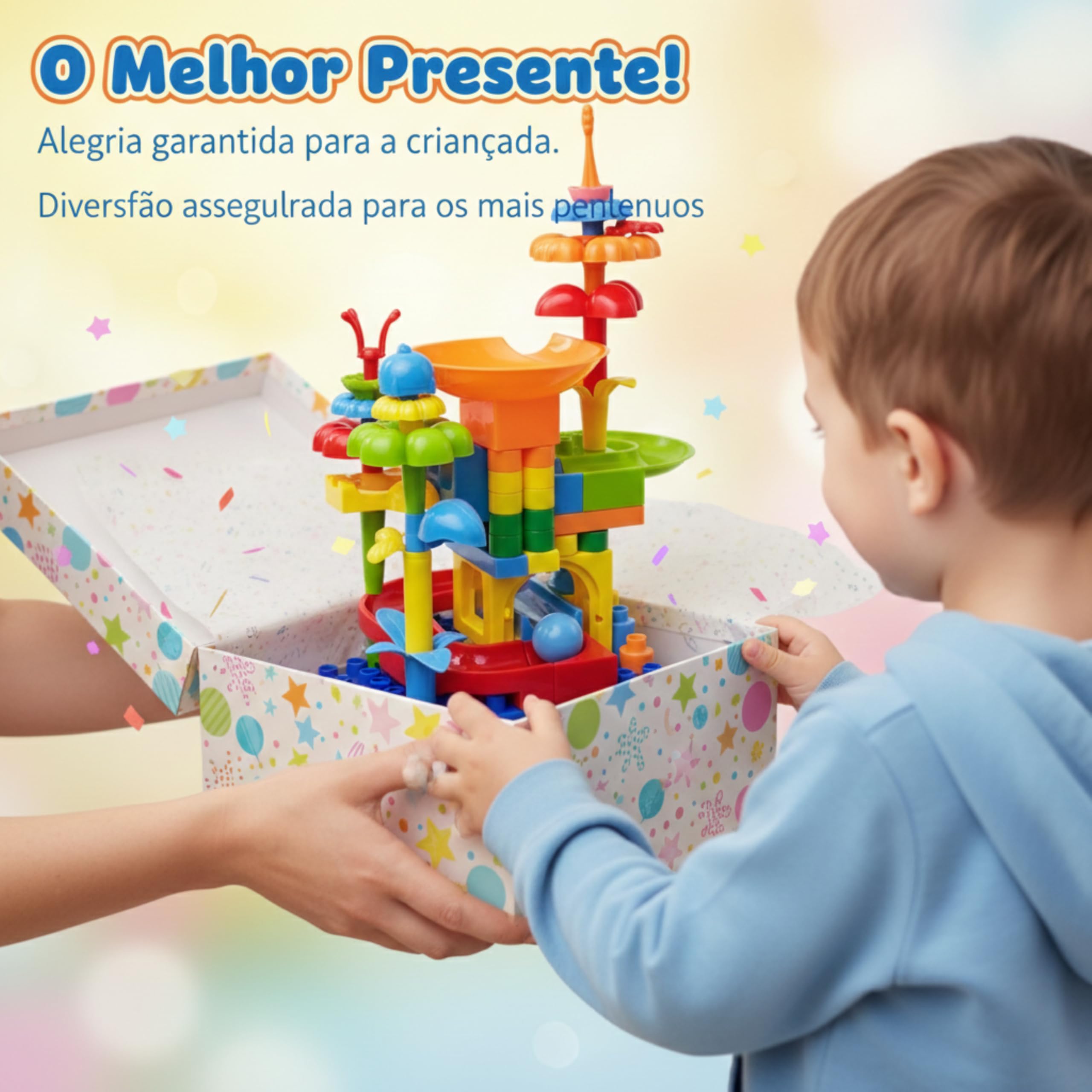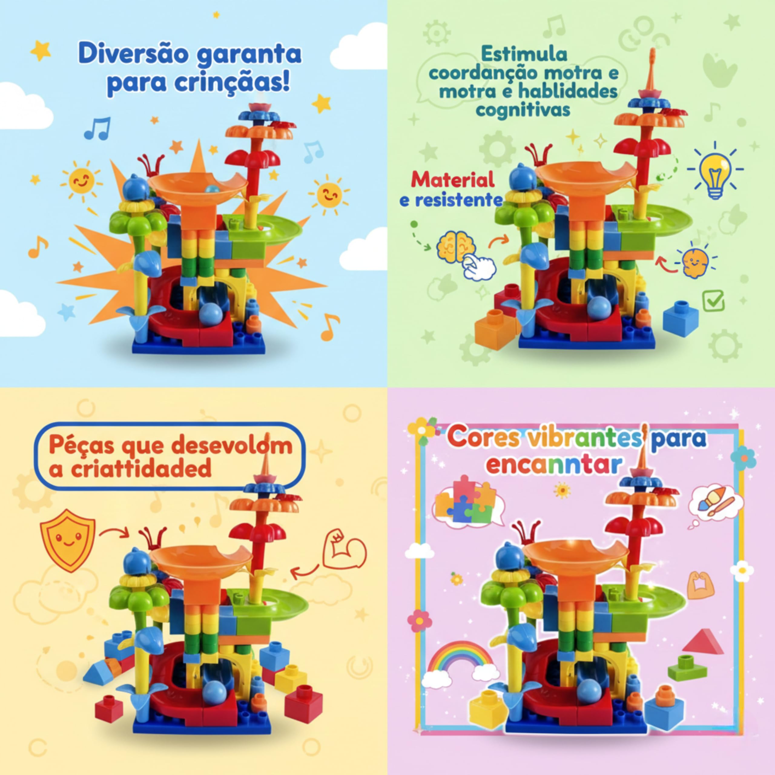 Esqueça os brinquedos que funcionam à base de pilhas barulhentas. Nossa pista de bolinhas funciona através da gravidade, ensinando lições de causa e efeito em tempo real. É um brinquedo educativo 3 anos em diante que oferece valor real, sendo mais engajante que giz de cera ou massinha. Sob a filosofia Montessori, cada pétala e rampa posicionada ajuda na motricidade fina, superando até os famosos blocos magneticos infantil em termos de construção mecânica vertical.