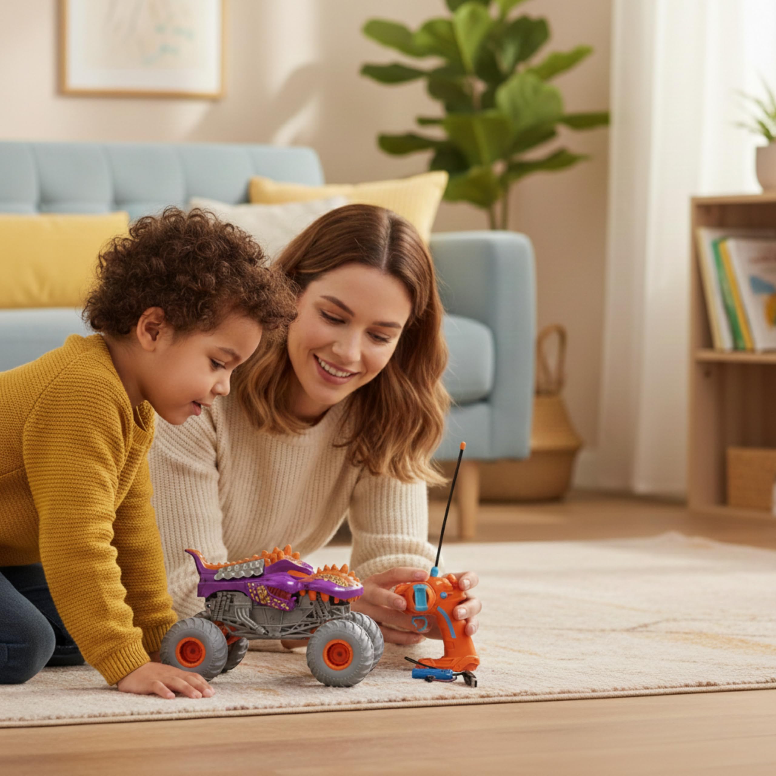 High-contrast purple and orange design appeals to both boys and girls who love dinosaurs., True 1:16 Scale Power: Larger than standard RC cars, providing a more “monster” feel and better obstacle clearance., USB Eco-Rechargeable: Eliminates the hidden cost of batteries, making it a favorite for practical parents., Glowing LED Eyes: Provides a night-play element and a “lifelike” dinosaur feel that increases child engagement.