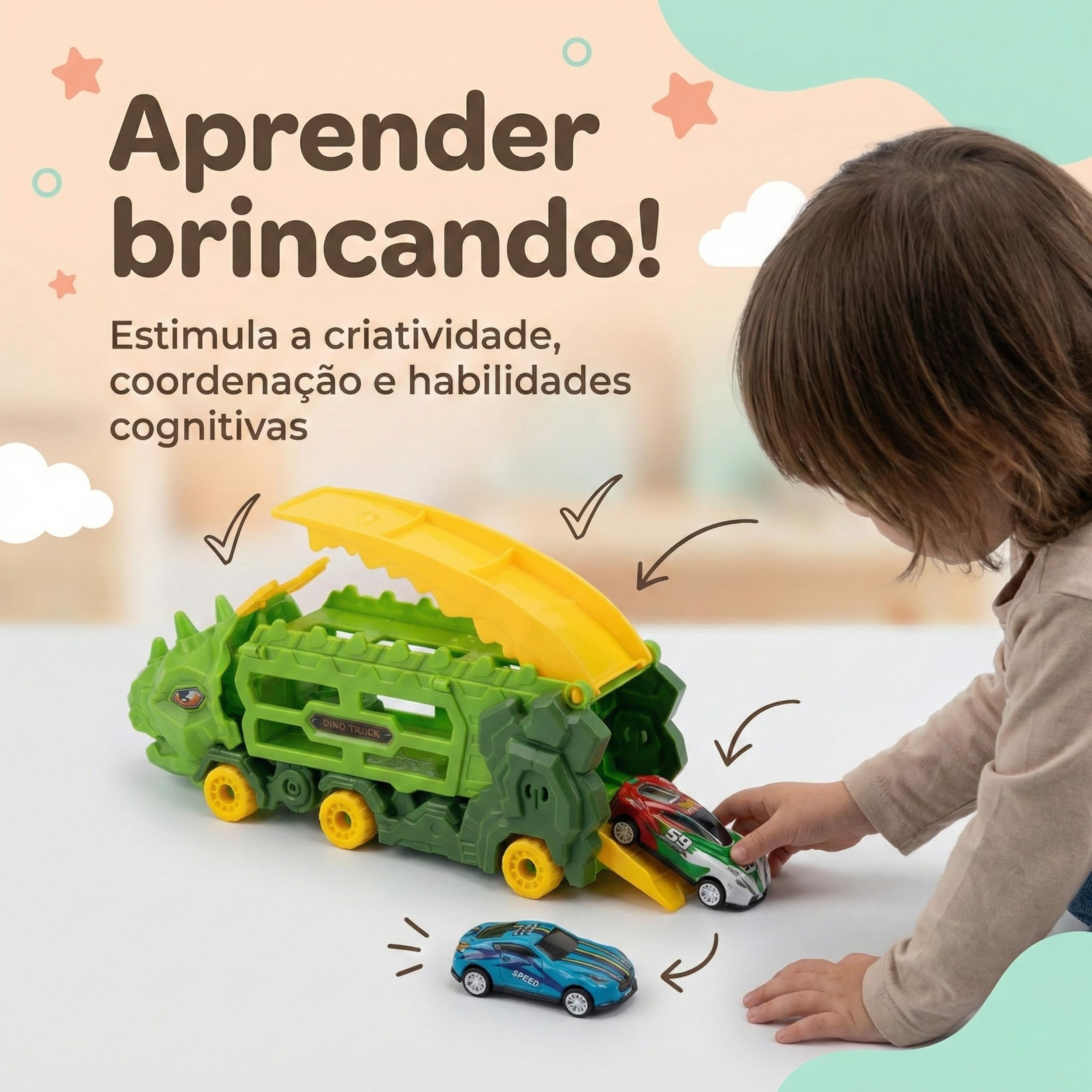 - ?? PRESENTE INESQUECÍVEL: O presente menino 3 anos ou presente menina 5 anos ideal para surpreender no Dia das Crianças. Este dinossauro brinquedo 2 em 1 funciona como um caminhão transportador “cegonha” e uma pista de alta velocidade, garantindo horas de diversão longe de qualquer tablet infantil ou laptop. ??