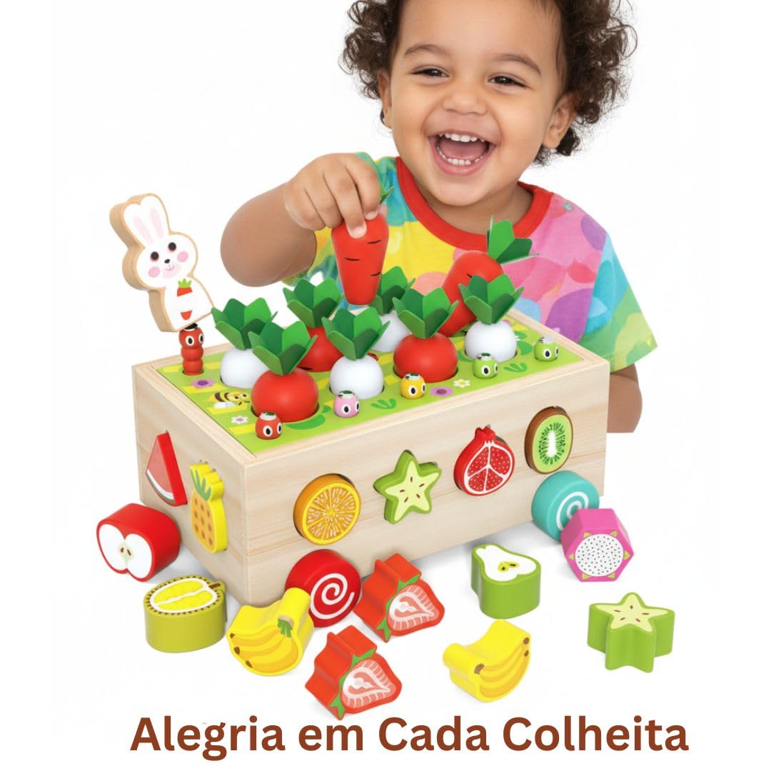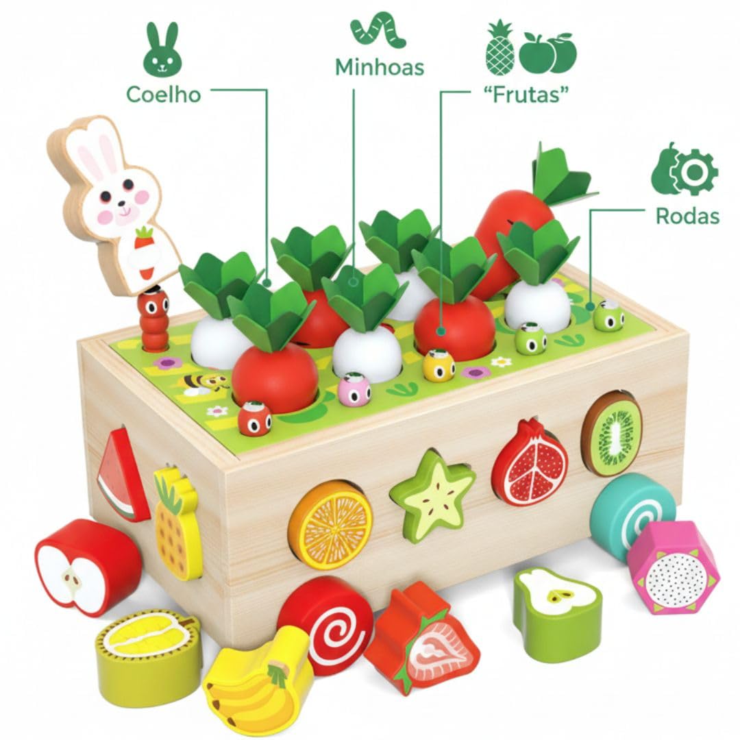 A criança pode se divertir colhendo cenouras de diferentes tamanhos, pescando minhocas coloridas com o coelho magnético ou encaixando as 12 peças de frutas nos espaços correspondentes. Este brinquedo de montar e encaixar ajuda no desenvolvimento da percepção espacial e na coordenação motora, oferecendo muito mais benefícios que uma simples massinha ou jogos de tabuleiro precoces.