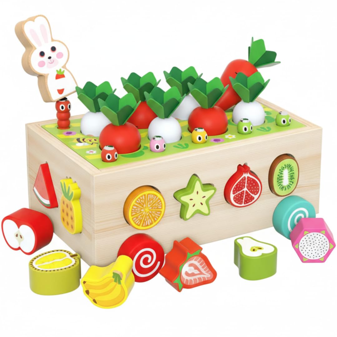 4-in-1 Play System: Combines carrot harvesting, magnetic worm catching, fruit shape sorting, and a push-along wagon., Large Capacity Storage: The wagon body serves as a storage box for all 25+ accessories, making cleanup easy., Magnetic Interactive Elements: Features a magnetic rabbit figure and colorful worms for a fun, skill-building “fishing” game., Sturdy and Safe Construction: High-quality wood with smooth edges and 360° polishing to prevent splinters., Dynamic Movement: Functional rolling wheels with spiral patterns allow the toy to move smoothly across flat surfaces.