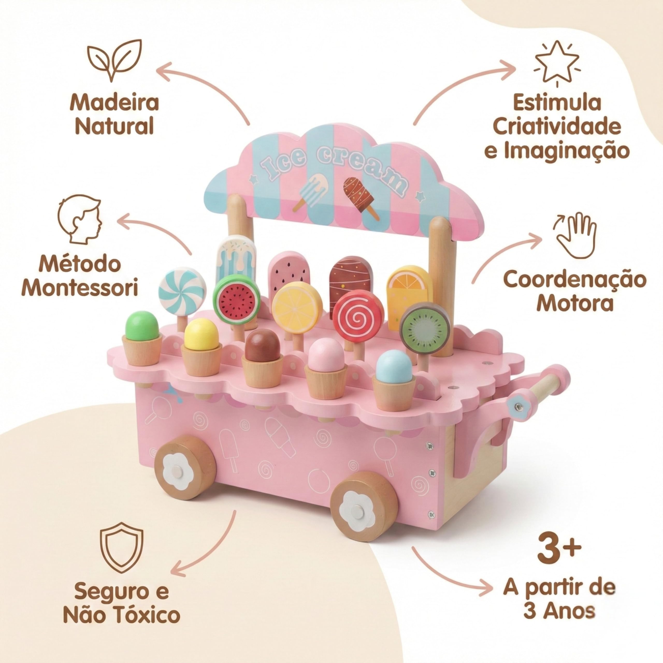 - ?? FAZ-DE-CONTA E CRIATIVIDADE: Este charmoso carrinho vem com vários sorvetes coloridos para a criança montar sua própria sorveteria. É um brinquedo educativo muito mais envolvente que um tablet infantil ou laptop, estimulando a interação social e a fala.