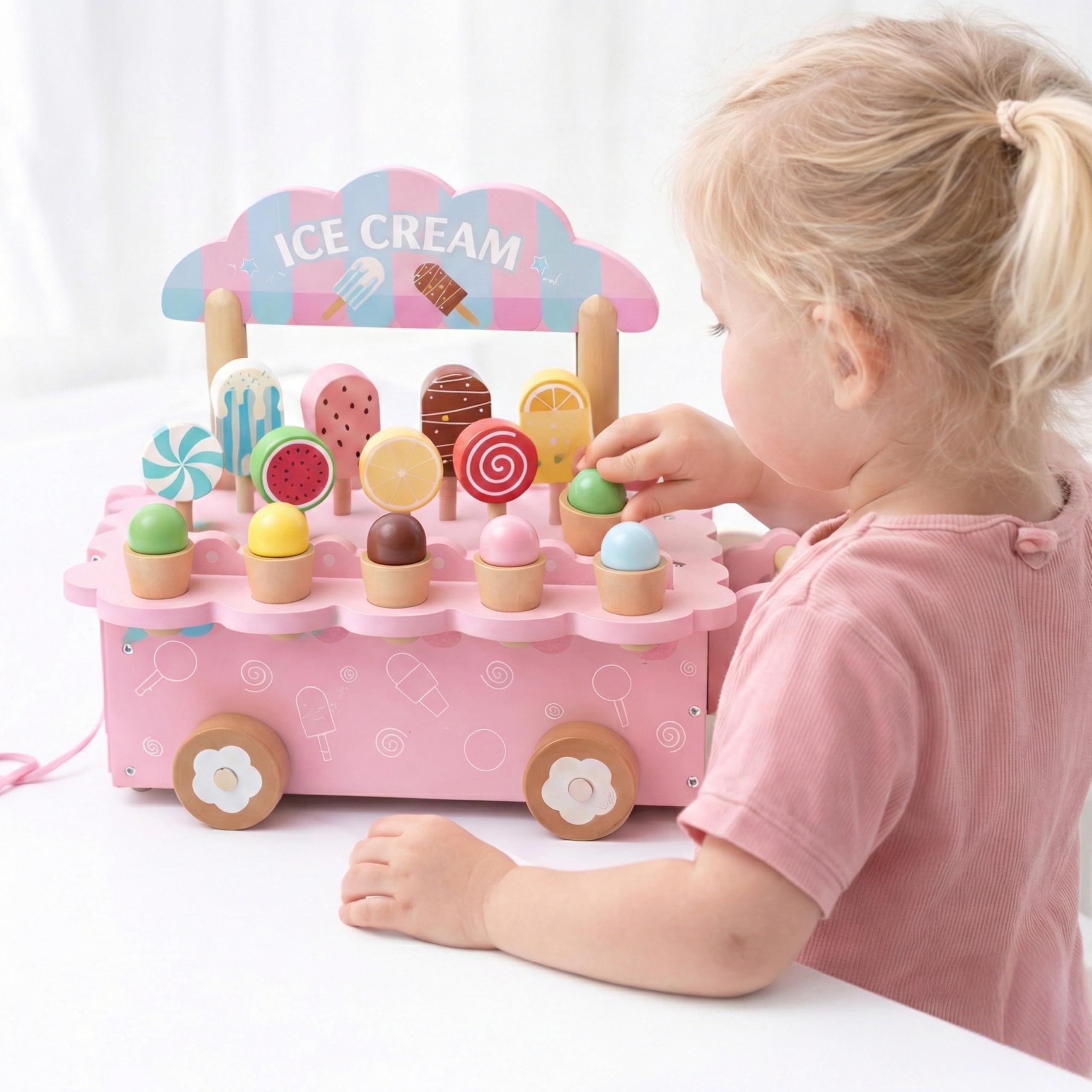 Estímulo à Imaginação e Jogo Simbólico (Faz-de-conta), Desenvolvimento da Coordenação Motora Grossa (Ato de puxar/andar), Habilidades Sociais e Comunicação, Organização e Classificação de Objetos, Reconhecimento de Cores e Formas, Coordenação Motora Fina (Manipulação dos sorvetes)