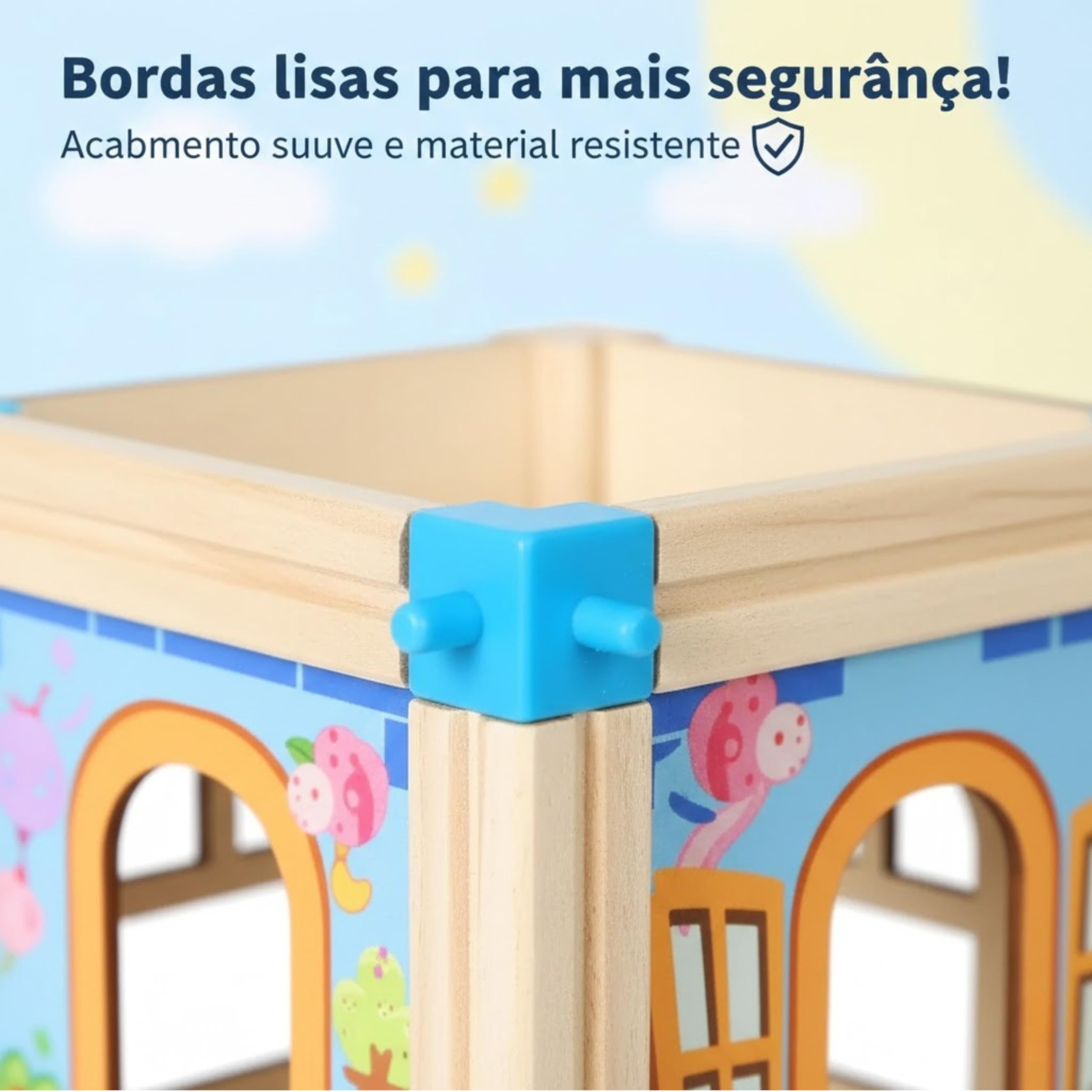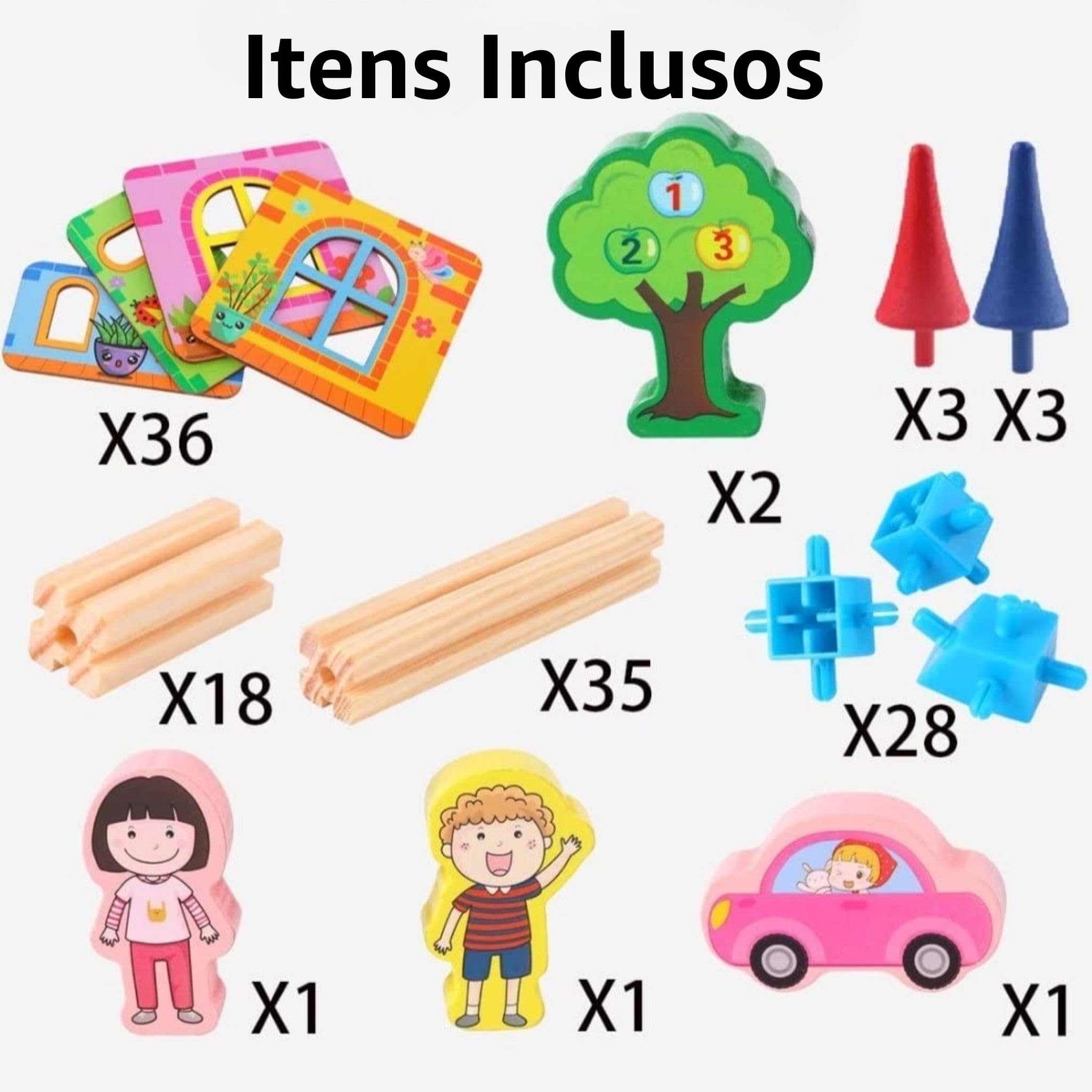 Incluso no Kit: Bonecos de madeira (família e pet), peças de encaixe colorido (azul, rosa, verde), árvores e peças estruturais. Transforme o tempo de tela em tempo de qualidade e veja a evolução do seu filho hoje mesmo!